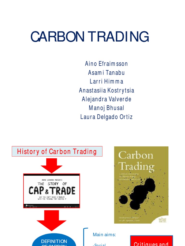 Definition of carbon trading in the definitions.net dictionary. Carbon trading is a system of limiting carbon emission through granting firms permits to emit a certain amount of carbon dioxide. It has been a central pillar of the eu's efforts to slow climate change. Emissions trading programs have two key components: Carbon trading definition at dictionary.com, a free online dictionary with pronunciation, synonyms and translation. The right to emit a tonne of co2 is often referred to as a carbon 'credit ' or carbon 'allowance'. An example of a carbon asset is the chicago climate exchange which has created a carbon financial instrument, defined as 1 metric tonne co 2 (chicago climate exchange, 2008b). How does carbon pricing work? Carbon trading requires a defined carbon asset. This is known as the carbon market. other trading units in the carbon market. Governments set a price for co 2 emissions. Carbon emissions trading is an environmental policy device that places an economic cost on carbon emissions. While in theory it provides a cheap and efficient means to limit greenhouse gas reductions.